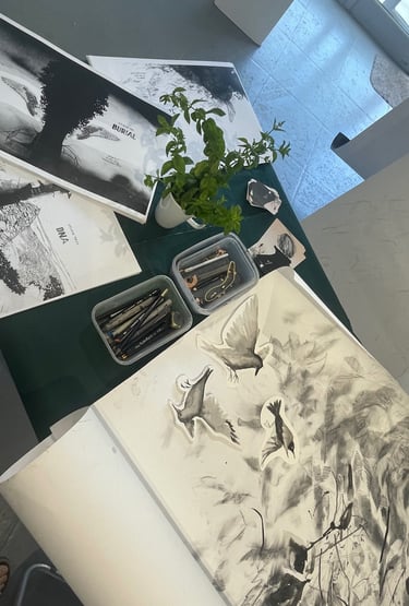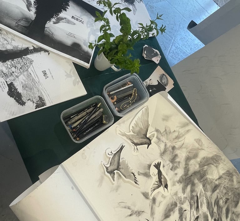 Manu Fly to the Sea is a work of creative graphic non-fiction being written and drawn into life. It's produced chapter by chapter in zine form, installed in open studio settings for engagement and via tabling at comic conventions. A later iteration will be as a complete work in book form with accompanying video animations.